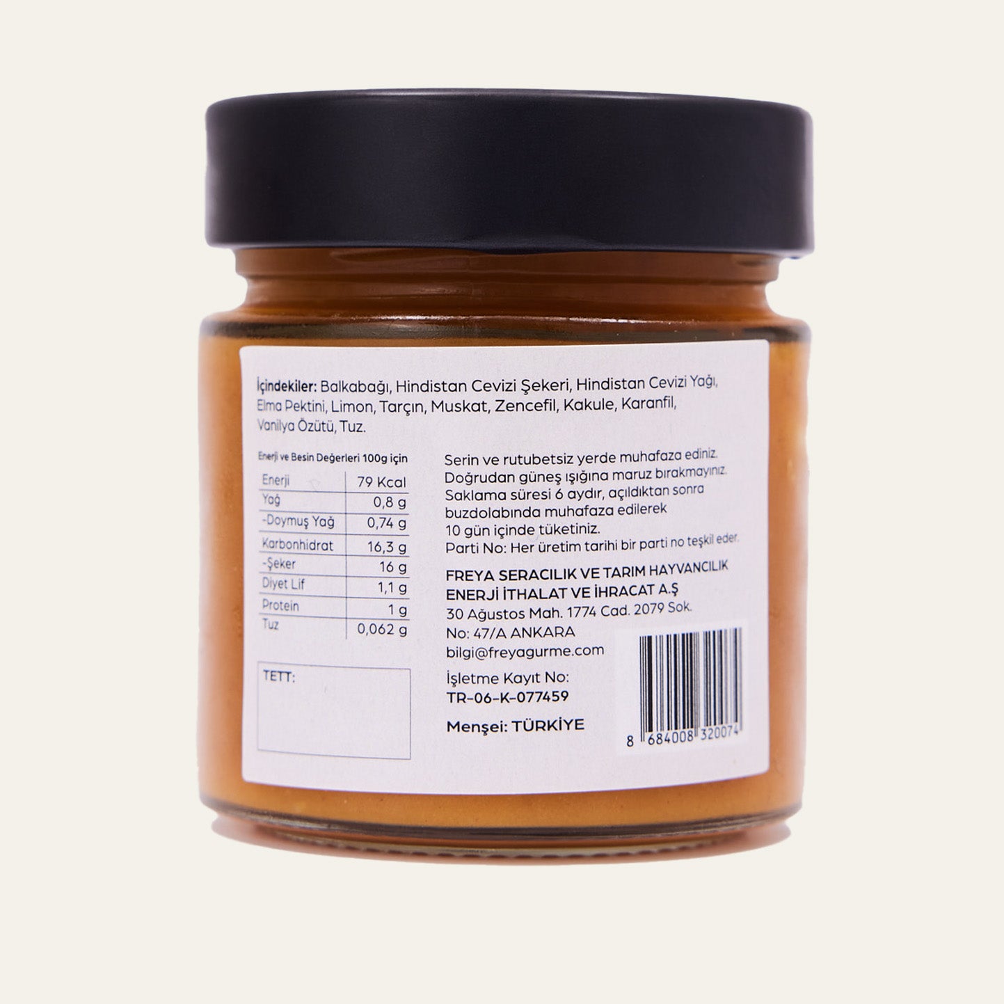 İçindekiler: Balkabağı, Hindistan Cevizi Şekeri, Hindistan Cevizi Yağı, Elma Pektini, Limon, Tarçın, Muskat, Zencefil, Kakule, Karanfil, Vanilya Özütü, Tuz